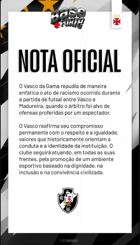 Vasco divulga nota de repúdio contra um ato de racismo que aconteceu em um jogo de Futsal da categoria Sub-10 contra o Madureira.