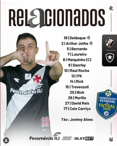 Esses são os atletas do Vasco que estarão à disposição do treinador Jonhny Alves para a partida de agora, às 18h, no clássico contra o Botafogo, pela 8ª rodada da fase de grupos do Estadual de futsal, na inauguração da Arena Oleybet.