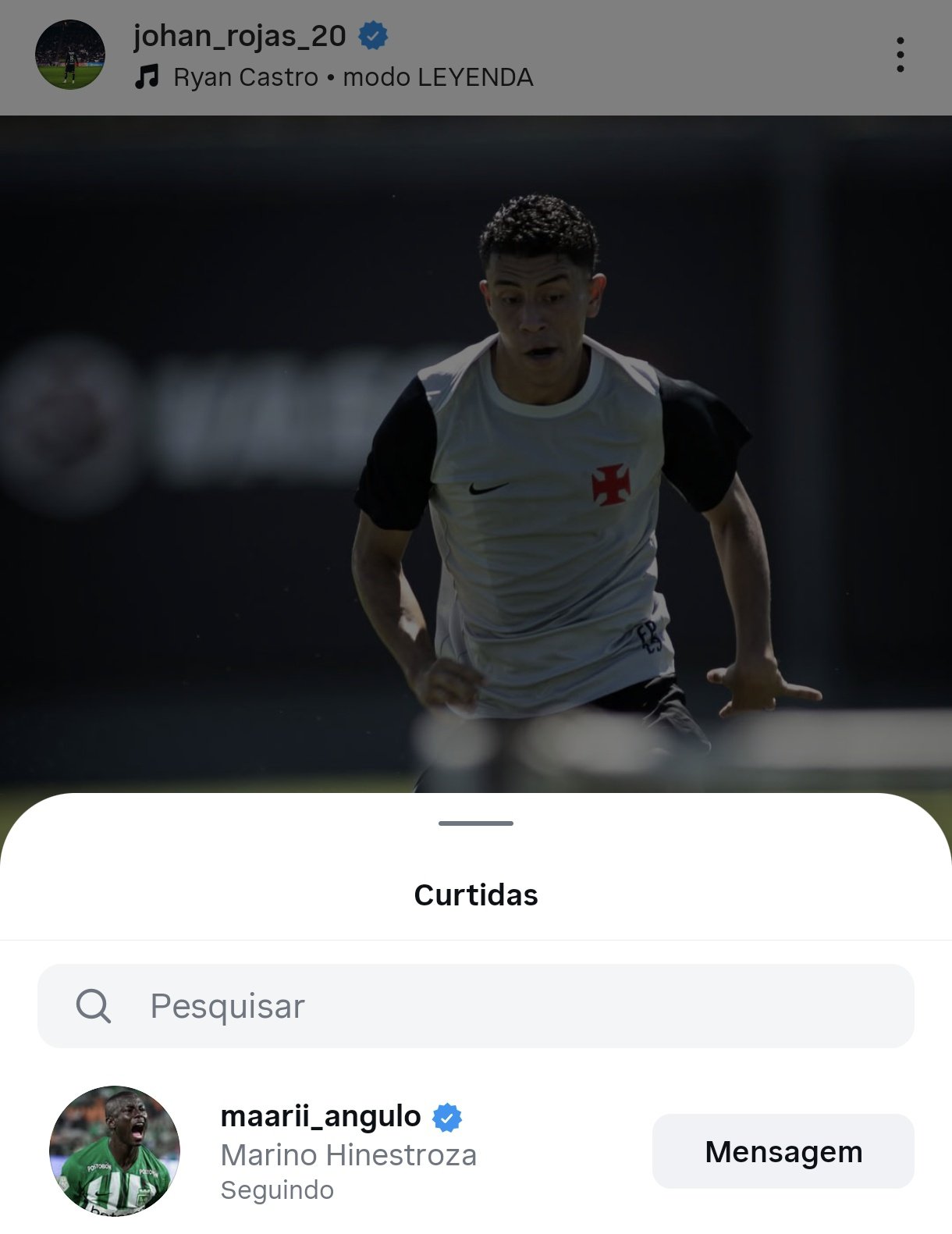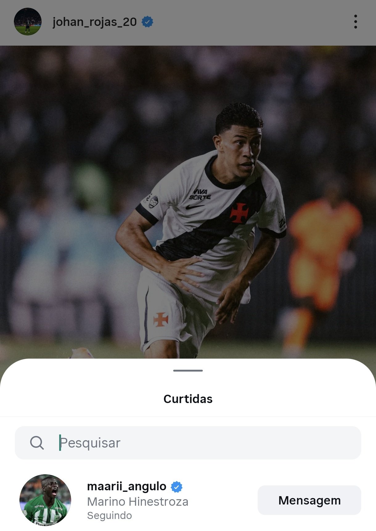 Hinestroza curtiu os últimos posts de Johan Rojas com a camisa do Vasco
