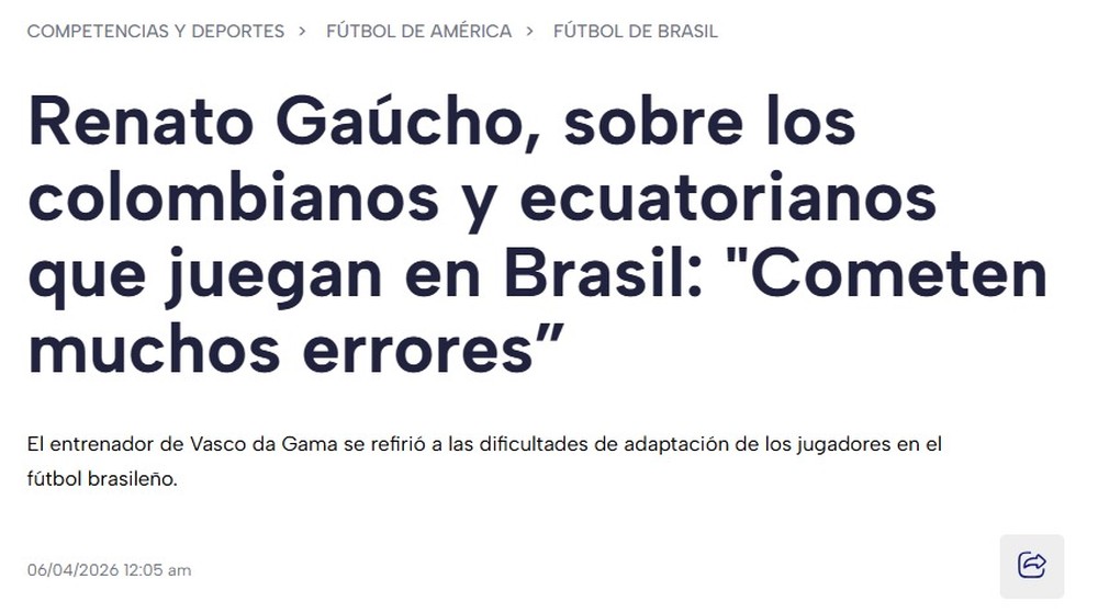 A declaração de Renato Gaúcho sobre a adaptação de jogadores colombianos no Vasco e no futebol brasileiro repercutiu bastante na imprensa da América do Sul. Jornais da Colômbia, Equador e Argentina deram destaque à opinião do treinador vascaíno.