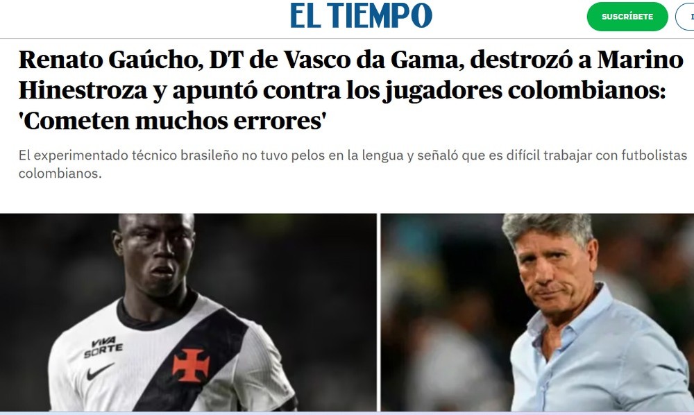 O jornal "El Tiempo" usou uma chamada mais exagerada e disse que Renato Gaúcho "destruiu" Marino Hinestroza. Veja abaixo outras reportagens de jornais sul-americanos.O jornal "El Tiempo" usou uma chamada mais exagerada e disse que Renato Gaúcho "destruiu" Marino Hinestroza. Veja abaixo outras reportagens de jornais sul-americanos.