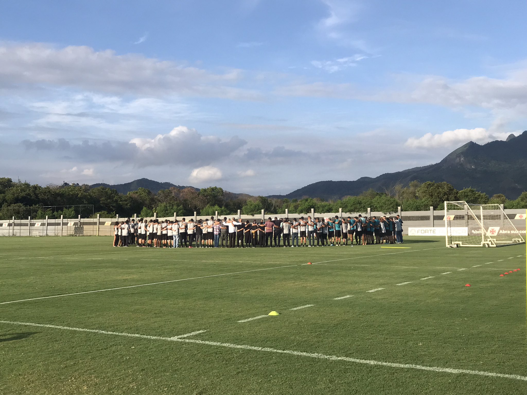 Jogadores, comissão e funcionários abraçados, na véspera da estreia na Série B. Que imagem!