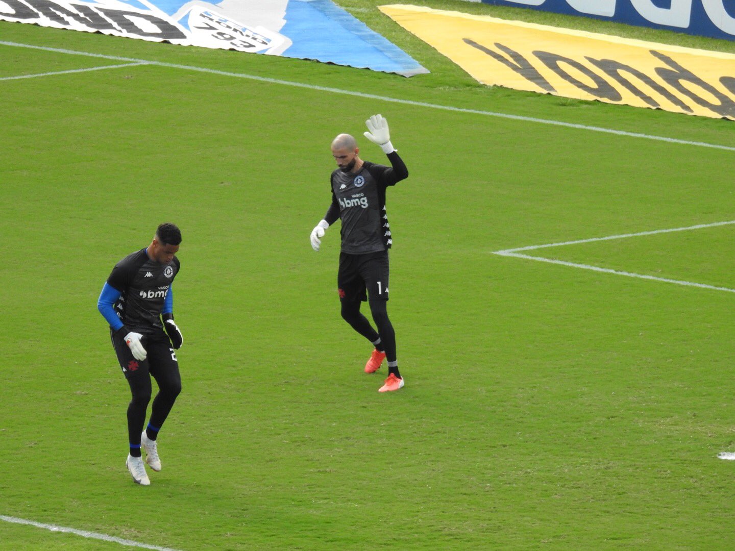 Lucão entrou em campo e teve seu nome gritado pela torcida. Vanderlei, barrado, também recebeu apoio e retribuiu. Halls é o outro goleiro do Vasco em campo. #trcolina