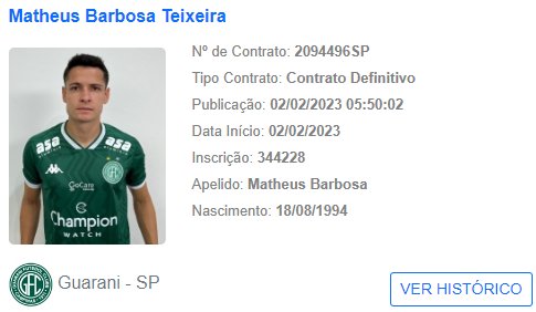 Ex-Vasco, Matheus Barbosa tem documentação regularizada no Boletim Informativo Diário (BID) e é liberado para estreia no Campeonato Paulista.