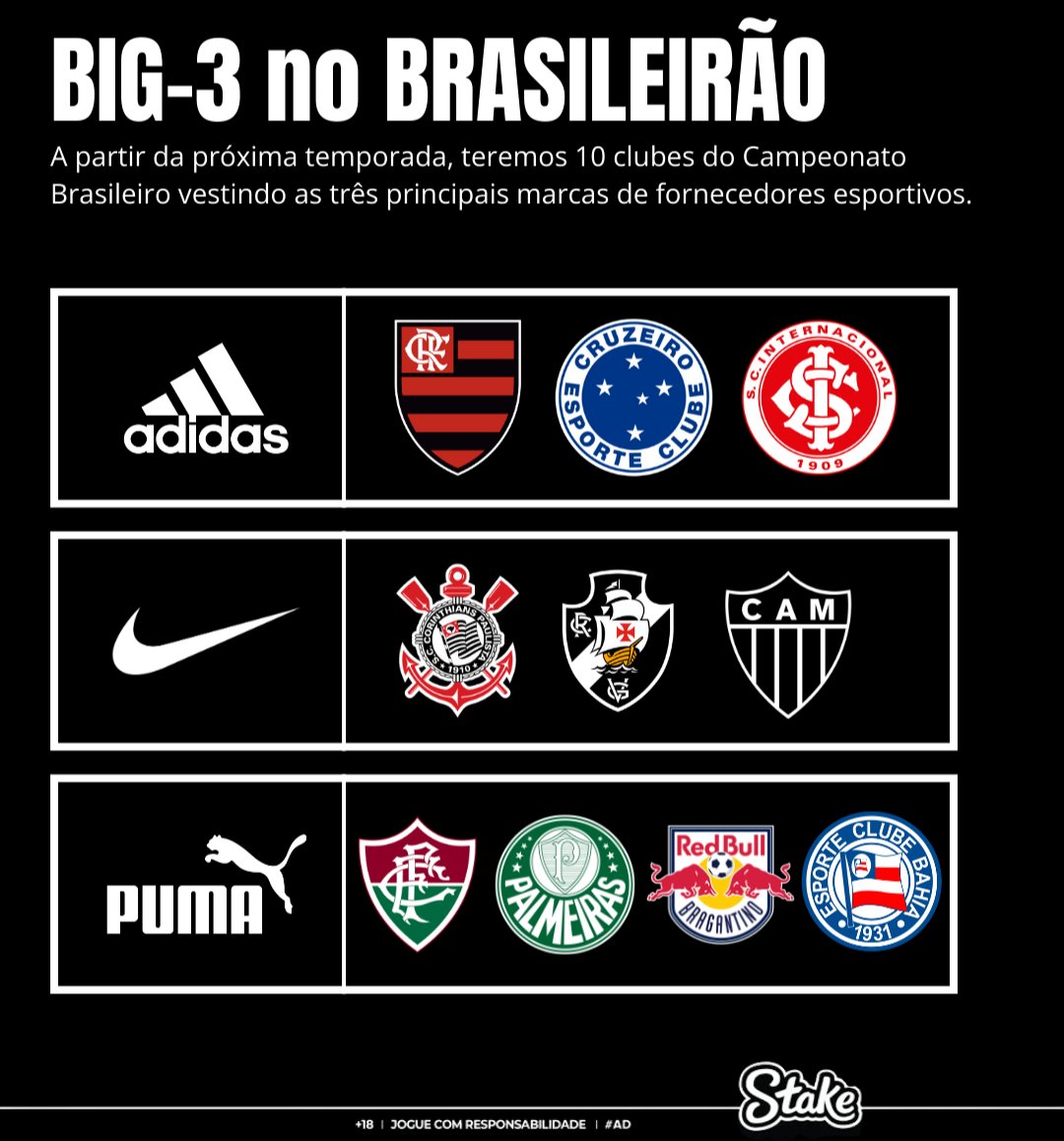 Flamengo, Cruzeiro e Internacional estão na Adidas. Corinthians, Vasco e Atlético Mineiro na Nike, e o Fluminense, Palmeiras, Red Bull Bragantino e Bahia.
