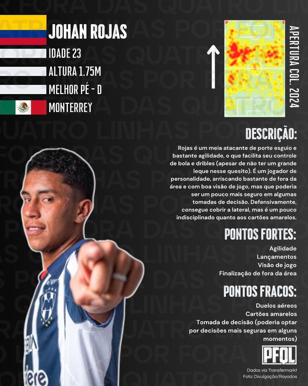 Johan Rojas é colombiano, com 23 anos, 1.75m e pé direito dominante. Ele começou sua carreira profissional no La Equidad, da Colômbia, onde se destacou em 2023 e 2024, sendo comprado pelo Monterrey, do México, em junho de 2024. Sem sucesso, foi emprestado para o Necaxa, também mexicano, entre fevereiro e julho do ano passado. Agora, está prestes a ser anunciado como novo reforço do Vasco da Gama.