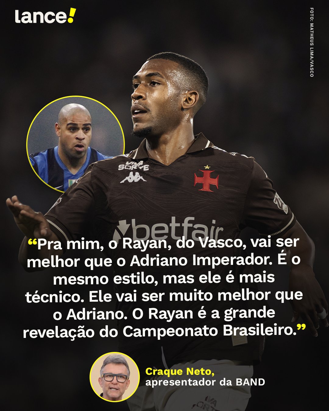 O Craque Neto não poupou elogios a Rayan, do Vasco! O apresentador comparou o jovem a Adriano Imperador e cravou: ele será melhor que o ídolo do Flamengo e Inter de Milão, além de ser a grande revelação do Campeonato Brasileiro.🇧🇷