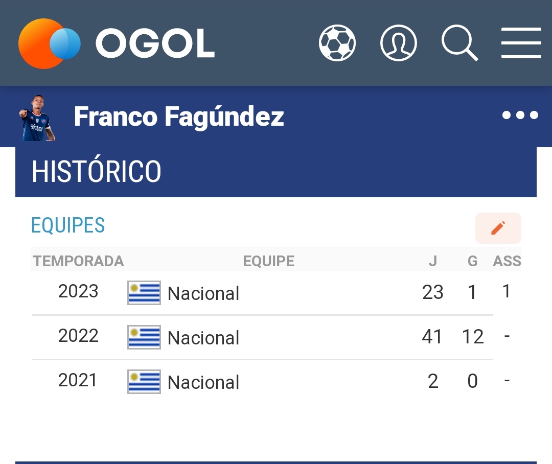 Números de Franco Fagundez, especulado no Vasco. reprodução/ogol