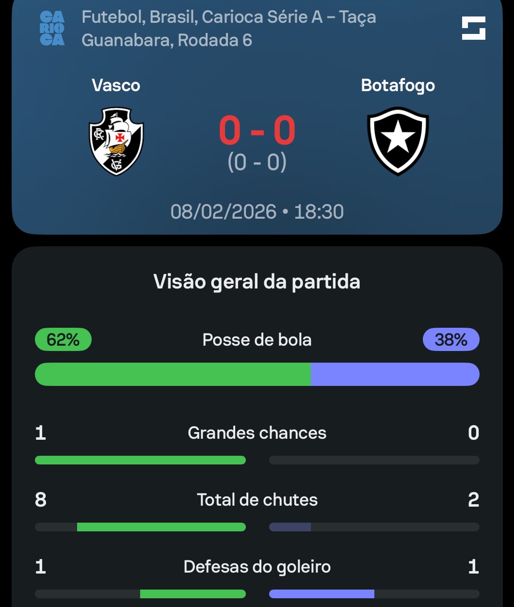 Final do 1º tempo de Vasco 0-0 Botafogo!