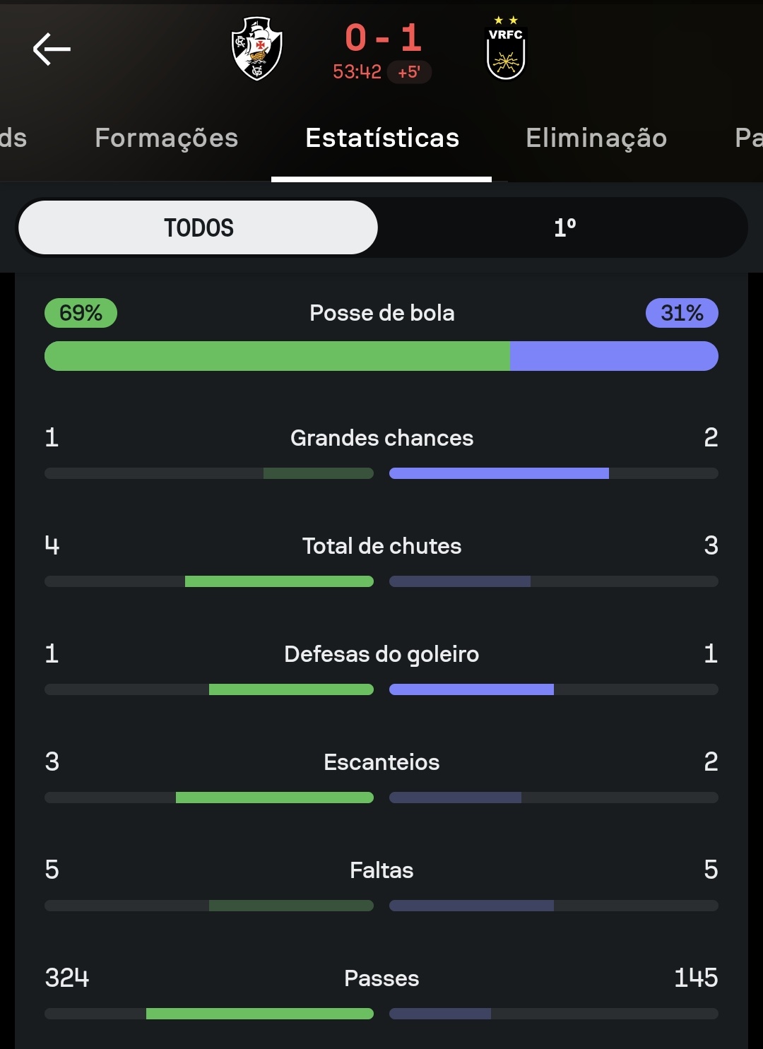 Números do 1° tempo de Vasco x Volta Redonda