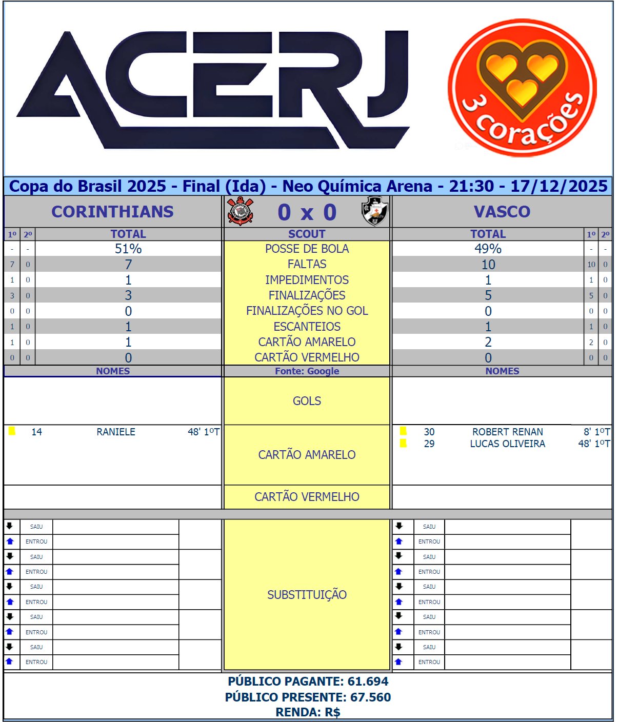 Scout do 1º Tempo de Corinthians e Vasco pelo jogo de ida da final da Copa do Brasil 2025 na Neo Química Arena (Fonte: Google)
