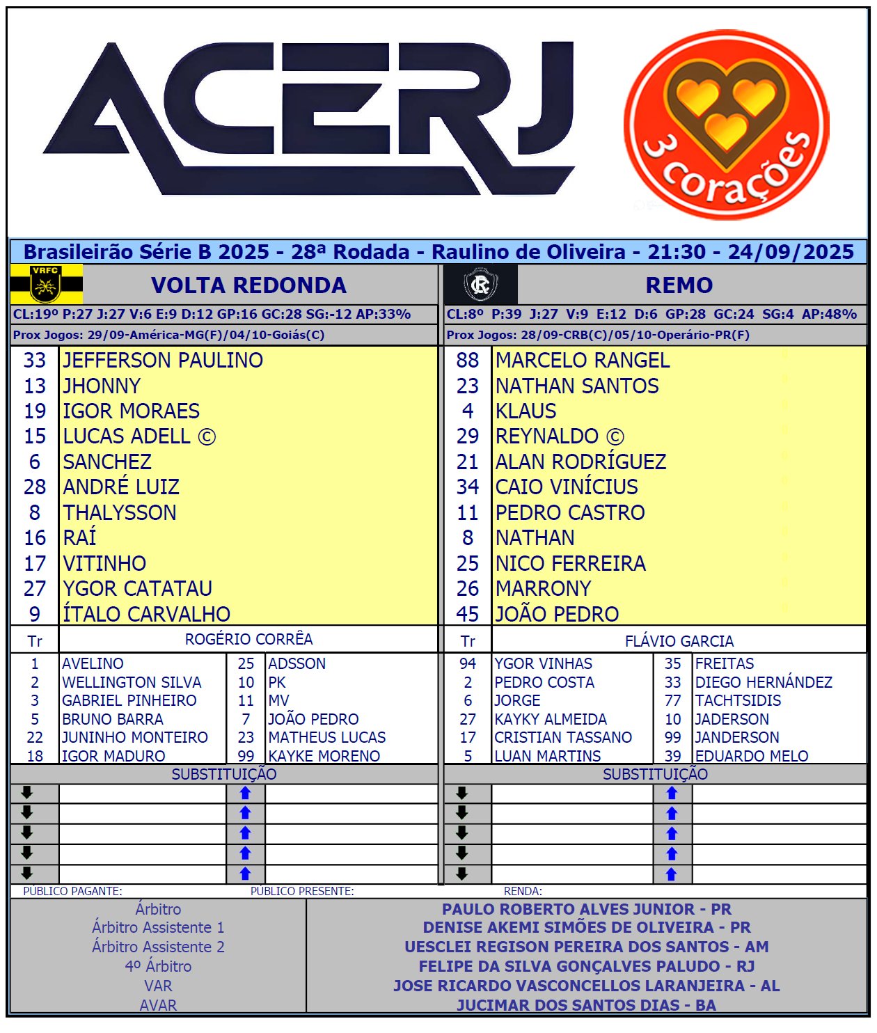 Escalações de Volta Redonda e Remo pela 28ª Rodada do Campeonato Brasileiro Série B 2025 no Raulino de Oliveira