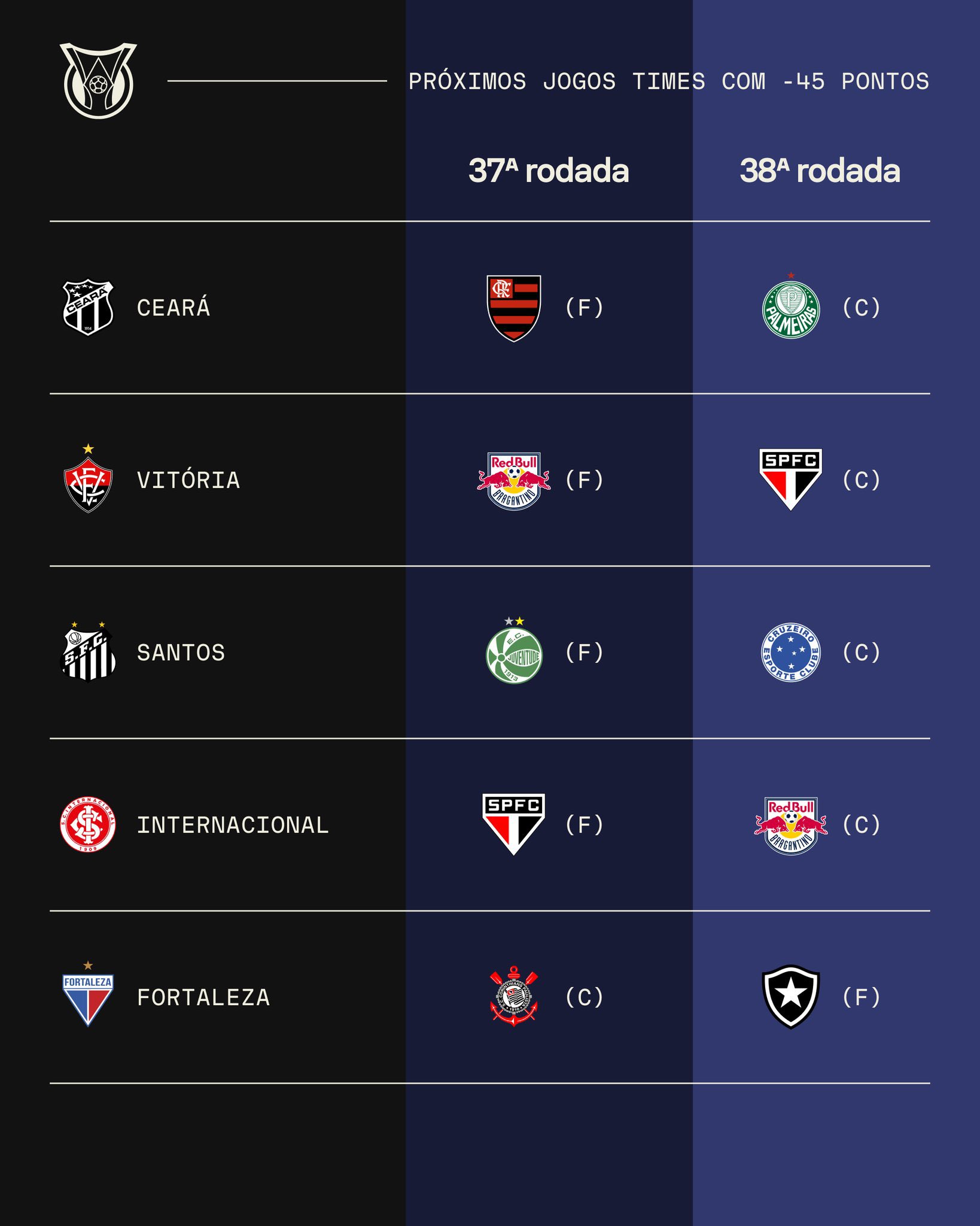 Os próximos dois jogos dos times com menos de 45 pontos.
