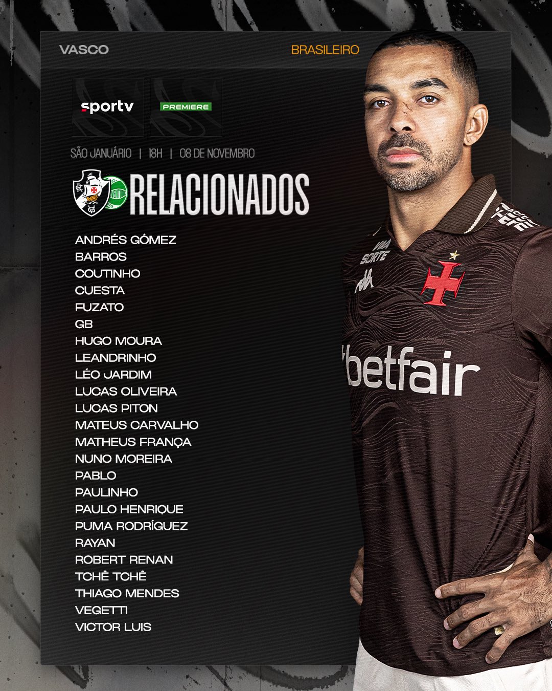 Os atletas do Vasco relacionados para o jogo diante do Juventude 💢