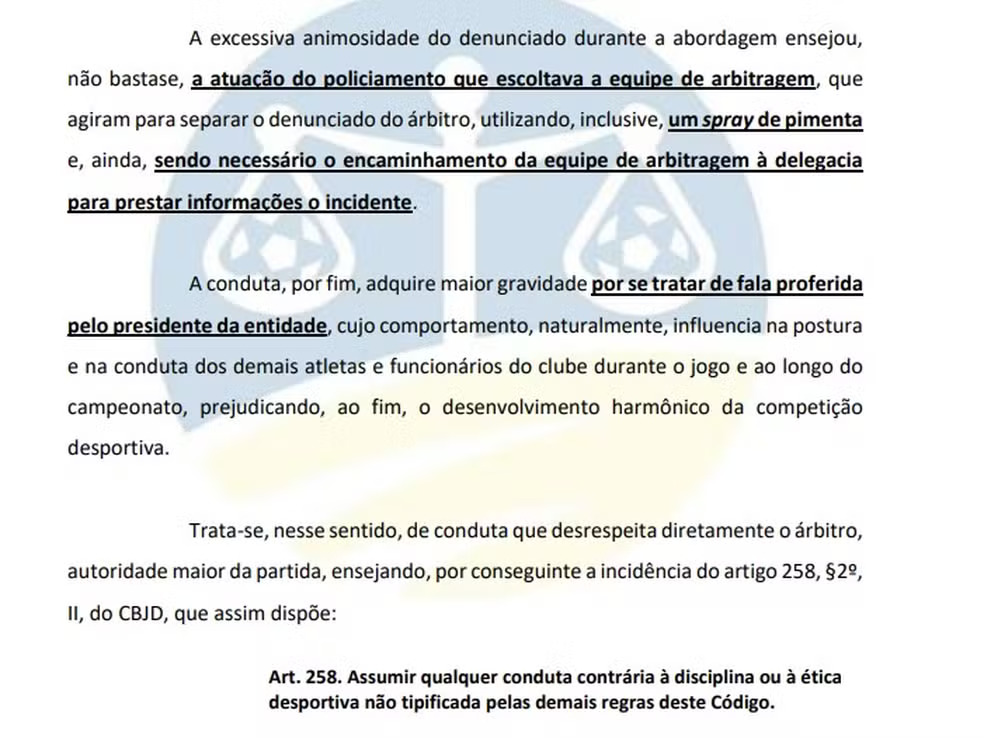 Já o fisioterapeuta Aldo Mattos foi denunciado com base no artigo 258, por conduta contrária à disciplina desportiva. Ele teria jogado uma bola em campo para retardar o reinício da partida, o que, segundo a Procuradoria, interferiu diretamente na dinâmica do jogo.