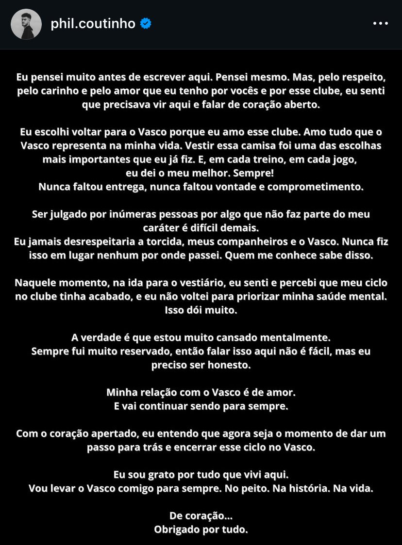 O meia Philippe Coutinho se pronunciou após pedir para sair do Vasco. O jogador alegou que está muito cansado mentalmente e disse que não voltou para o intervalo na partida contra o Volta Redonda para priorizar a sua saúde mental.