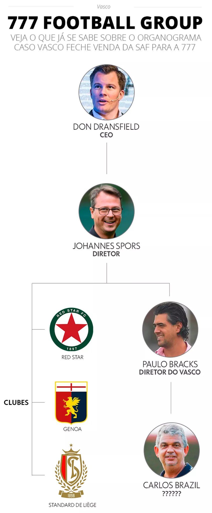 Esse aqui é o organograma básico da 777 Football Group, braço da holding que cuida do futebol. O CEO é o Don Dransfield, que esteve no Rio nesses últimos três dias. É sob o guarda-chuva dele que o Vasco vai ficar caso feche a venda da SAF, ao lado dos outros clubes do grupo.
