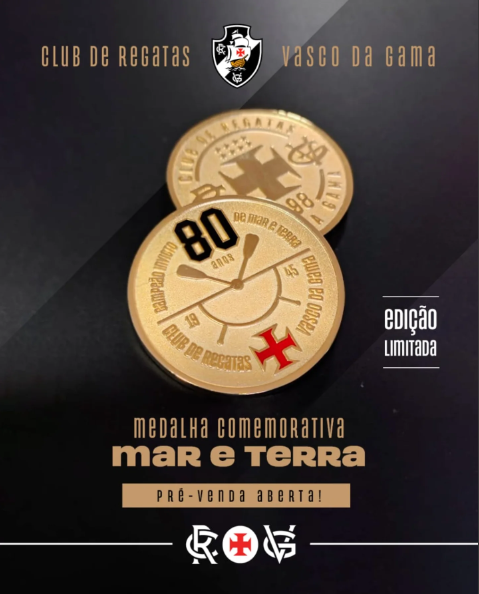 Já está disponível a medalha comemorativa dos 80 anos da conquista invicta de Mar e Terra, uma homenagem ao feito de 1945, quando o Vasco foi Campeão Invicto de Remo e Futebol.