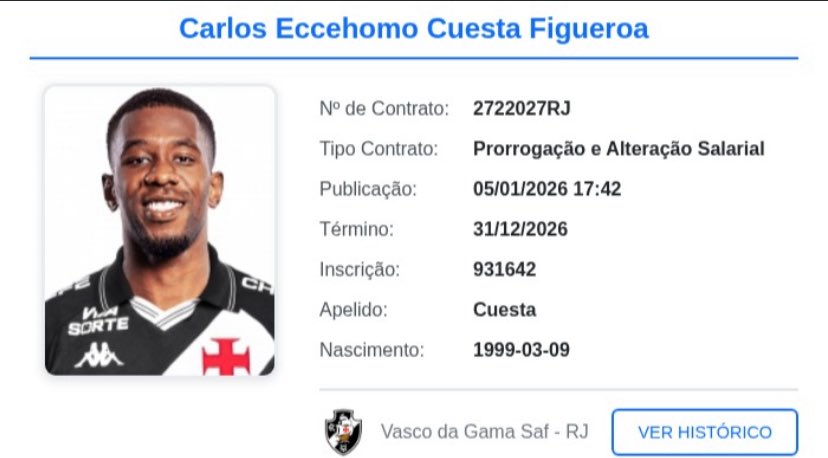 🚨💢🇨🇴 Carlos Cuesta está garantido no Vasco até dezembro de 2026.