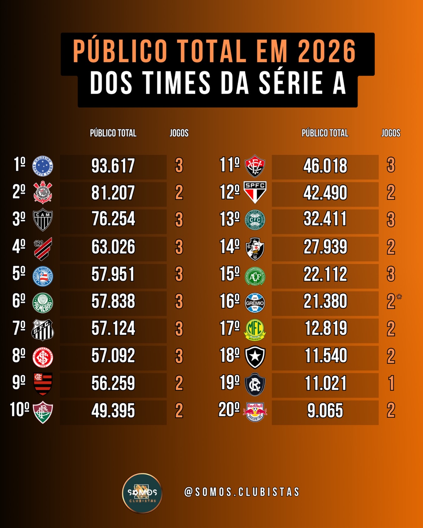 O Cruzeiro levou 93.617 torcedores ao estádio em 2026. Bem pertinho e com um jogo a menos em casa, o Corinthians levou 81.207 torcedores ao seu estádio.