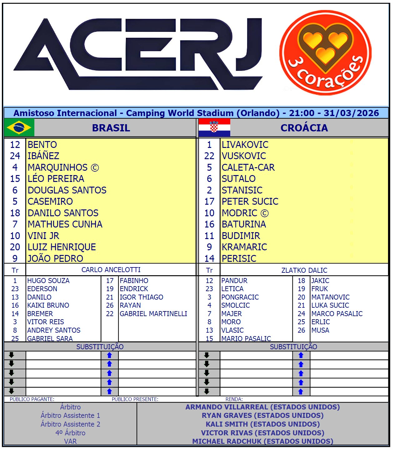 Escalações de Brasil e Croácia em jogo amistoso de preparação para a Copa do Mundo de 2026 no Camping World Stadium em Orlando #Acerjinforma #BRAxCRO #BRACRO