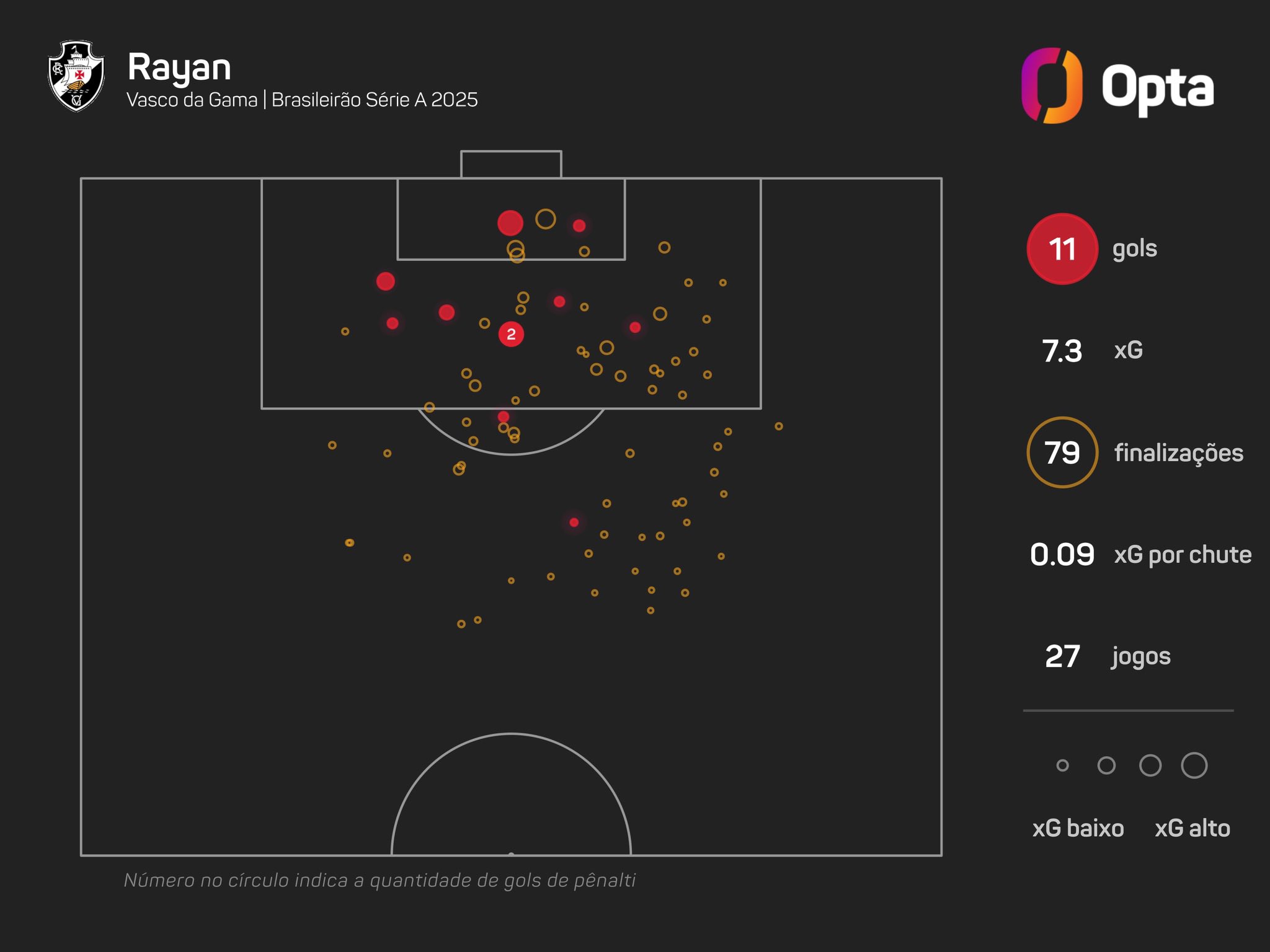 4 - Dos 24 jogadores com mais de 5 gols marcados no Brasileirão Série A 2025, Rayan, do Vasco, é o quarto que mais supera sua expectativa de gols no campeonato: 7.28 xG e 11 bolas na rede (+3.72 em relação ao esperado). Joia.