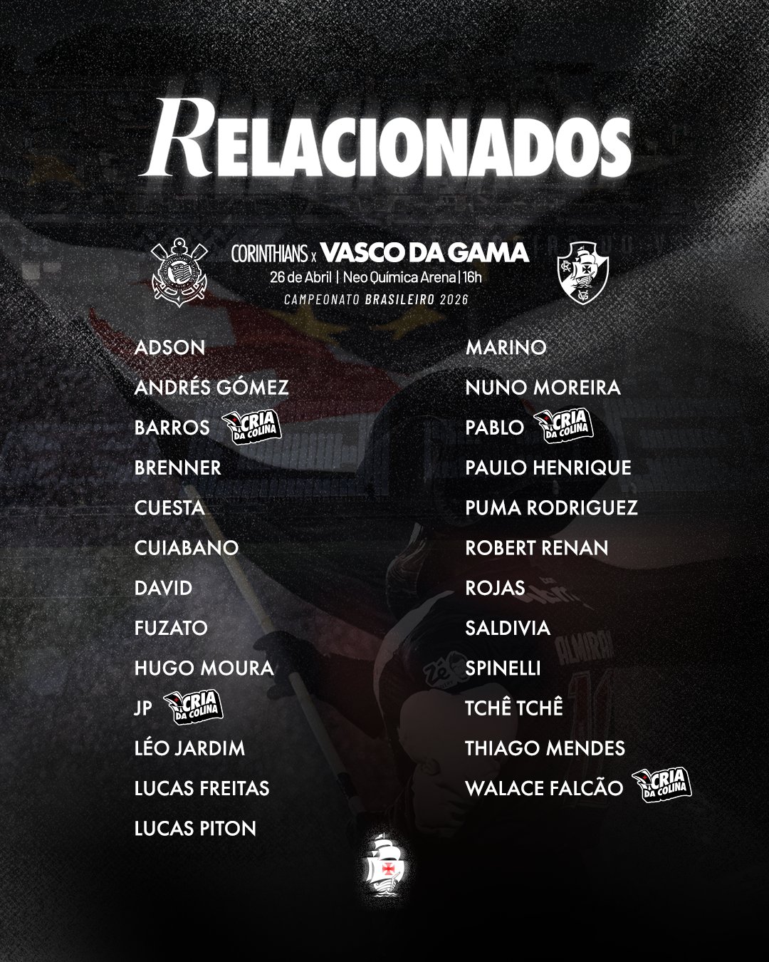 📋 Relacionados do Vasco da Gama para enfrentar o Corinthians, na Neo Química Arena, pelo Brasileirão. 💢