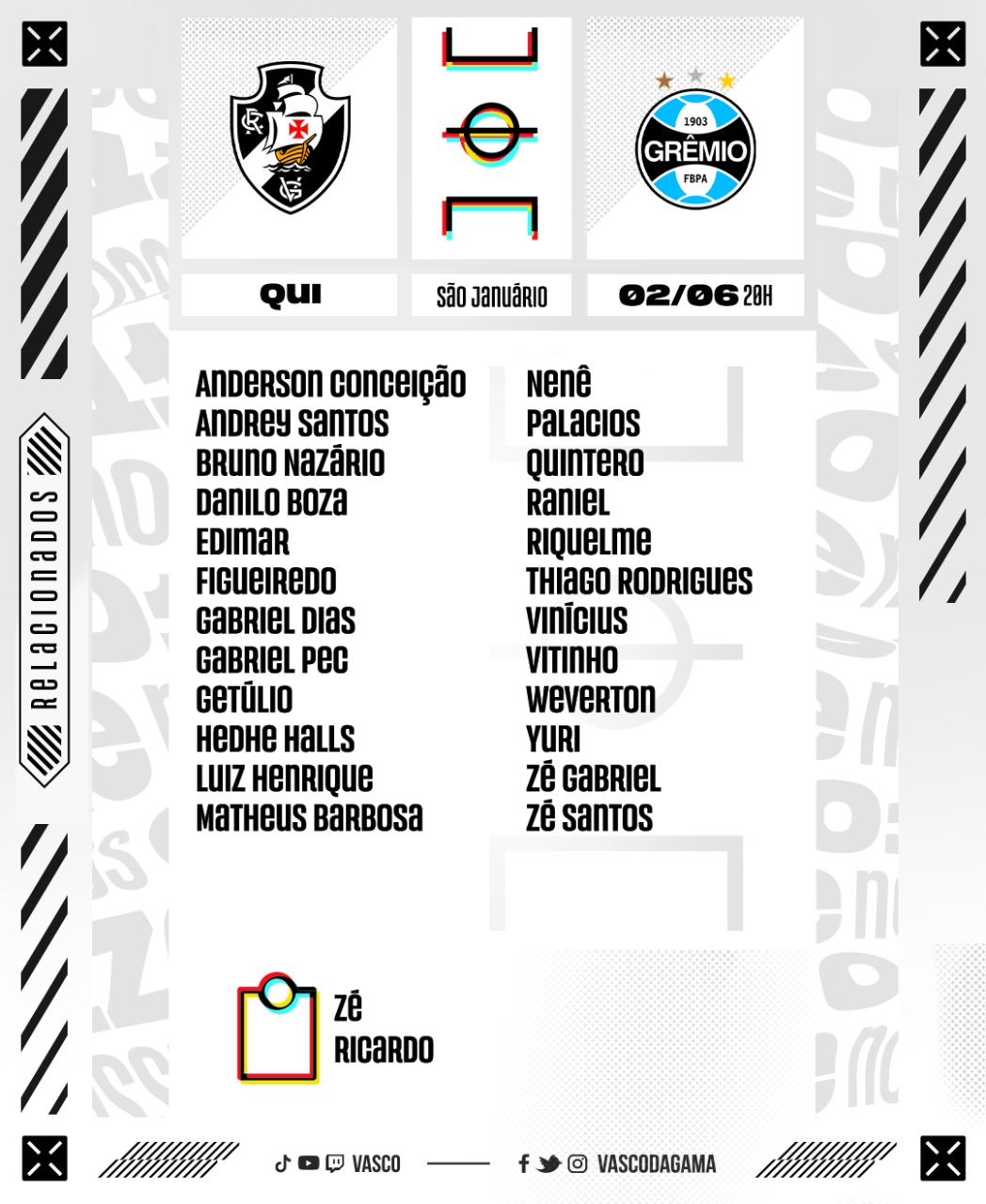 Os relacionados pelo técnico Zé Ricardo para a partida diante do Grêmio. #VASxGRE #VascoDaGama