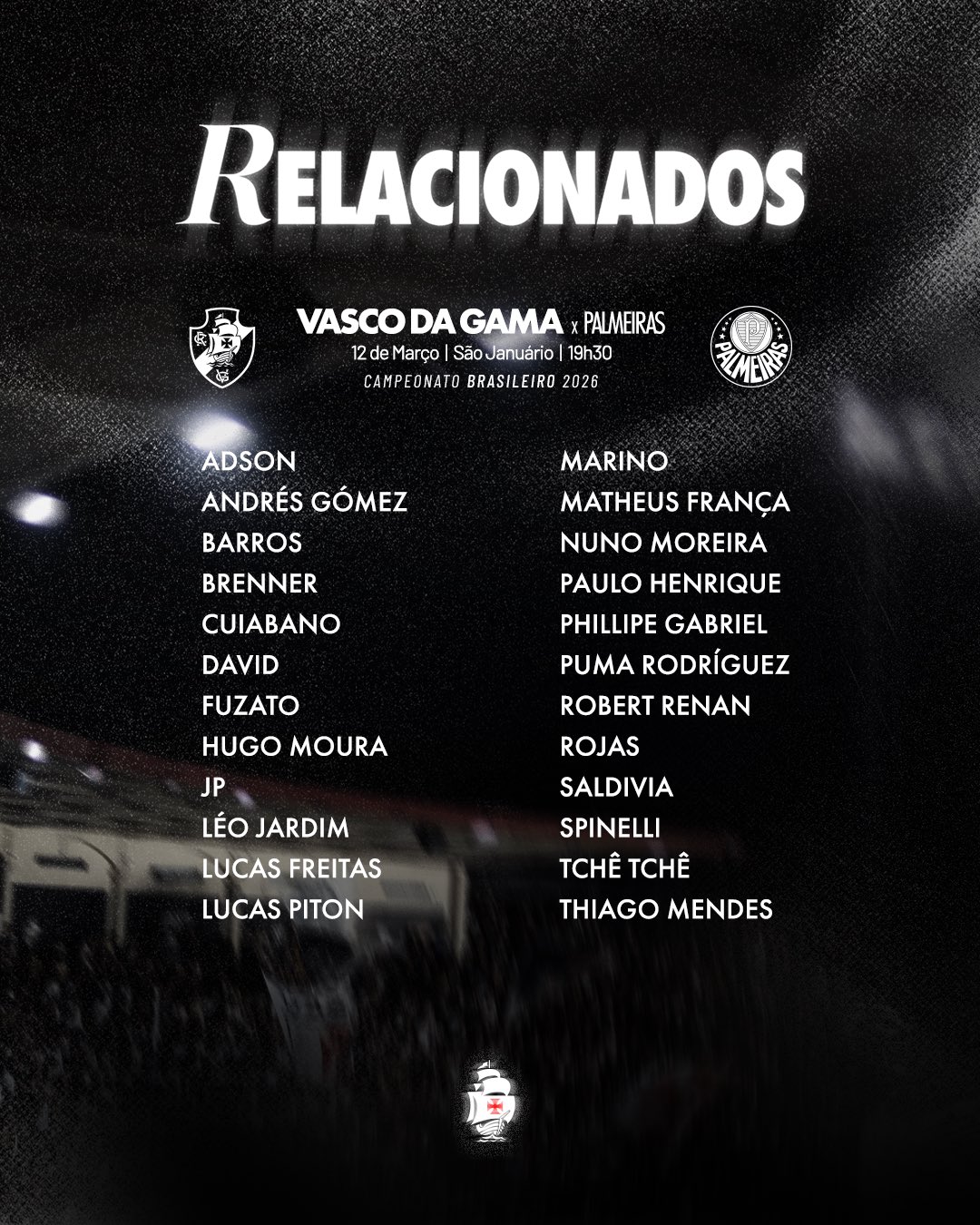 📋 𝚁𝚎𝚕𝚊𝚌𝚒𝚘𝚗𝚊𝚍𝚘𝚜 do Vasco para a partida diante do Palmeiras 💢