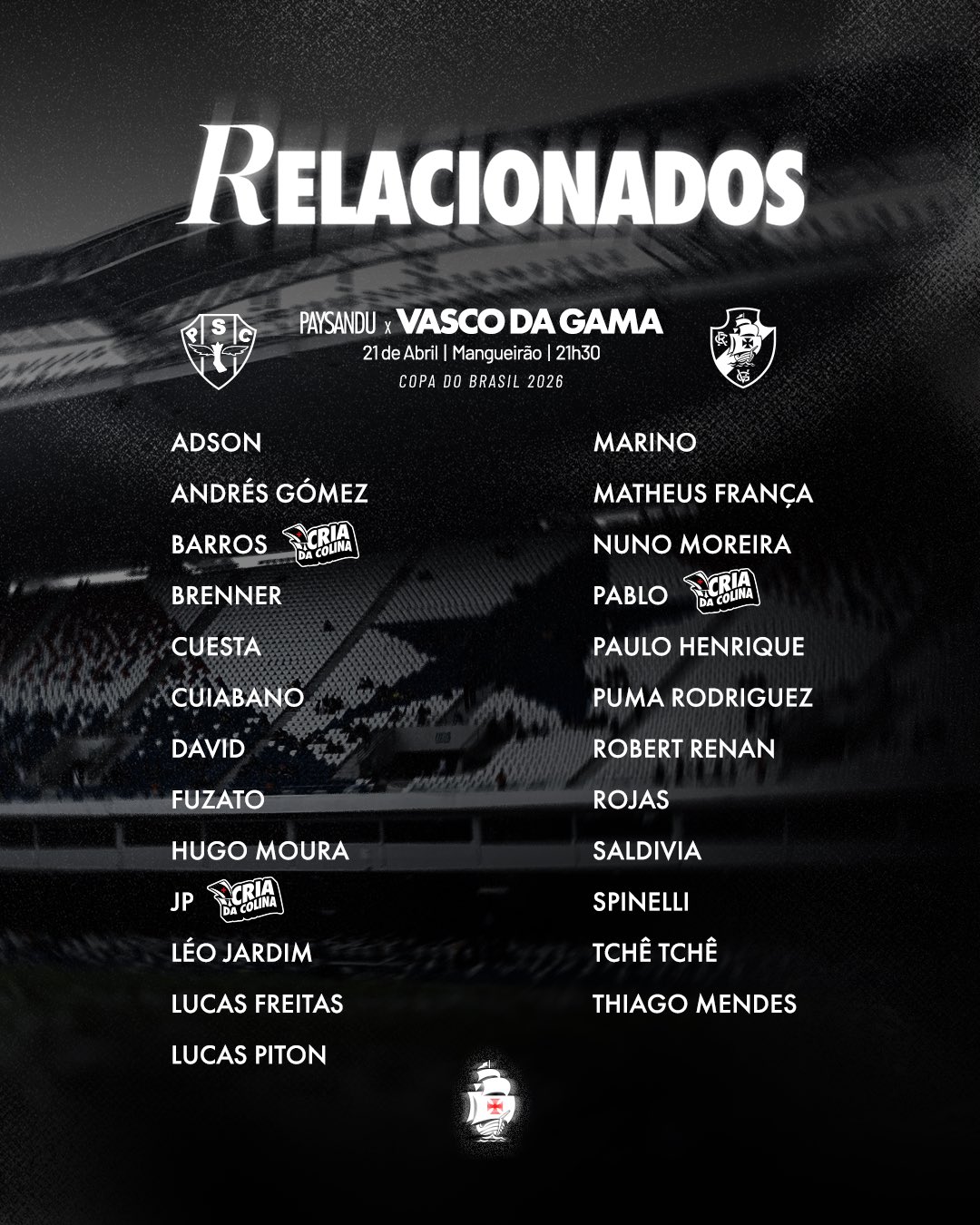 📋 Relacionados do Vasco da Gama para enfrentar o Paysandu na estreia da Copa do Brasil 💢