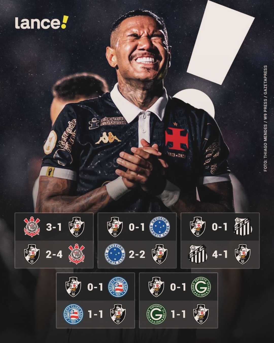 De 30 pontos disputados, o Vasco conquistou apenas três pontos, em três empates com Goiás, Bahia e Cruzeiro. Com a queda, com certeza esse será um dos pontos cruciais para a queda divulgação/lance