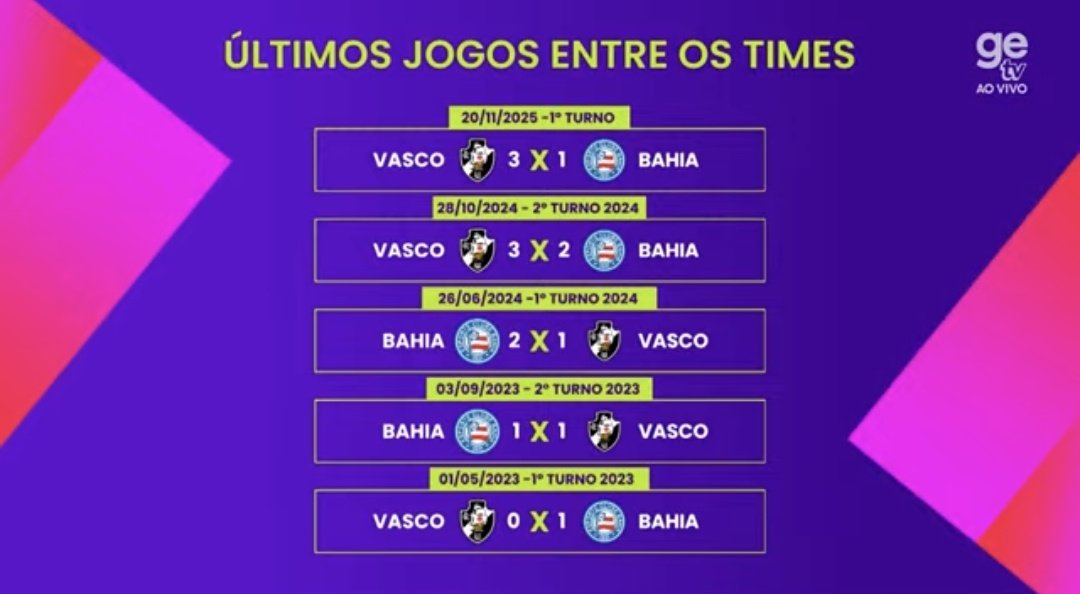 🚨 Últimos 5 confrontos entre VASCO e Bahia.