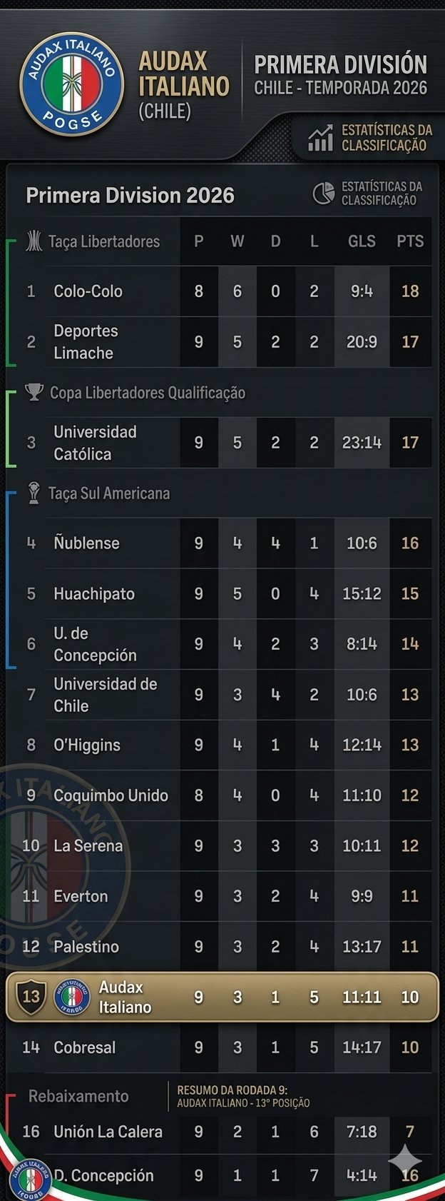 O AUDAX ITALIANO está na DÉCIMA TERCEIRA colocação do Campeonato Chileno e lá só tem Dezesseis times competindo.