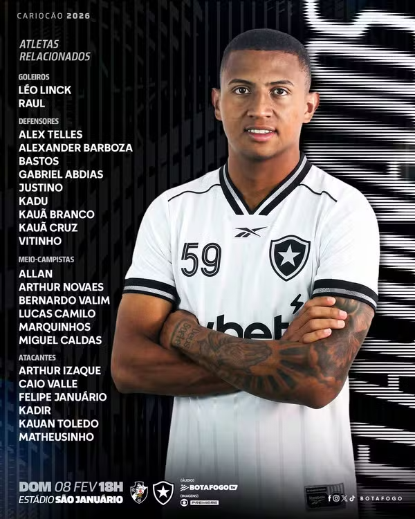 Léo Linck, Raul, Vitinho, Alexander Barboza, Bastos, Alex Telles e Allan são os profissionais relacionados. O Botafogo terá jovens em campo para completar o time contra o Vasco.