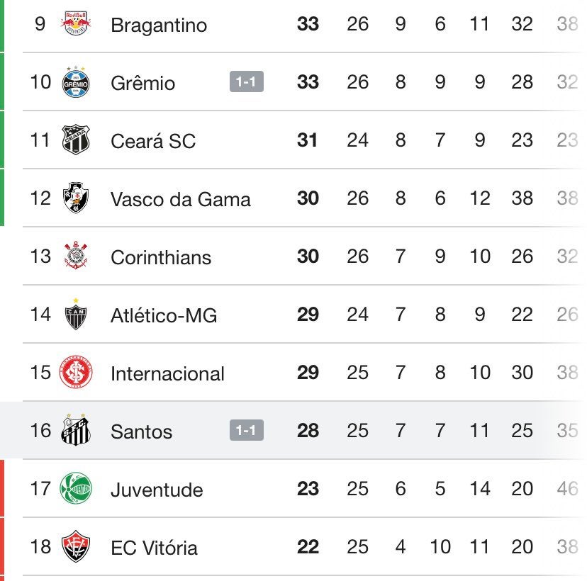 Com os resultados da 26° rodada até agora, o Vasco segue na 12° posição.