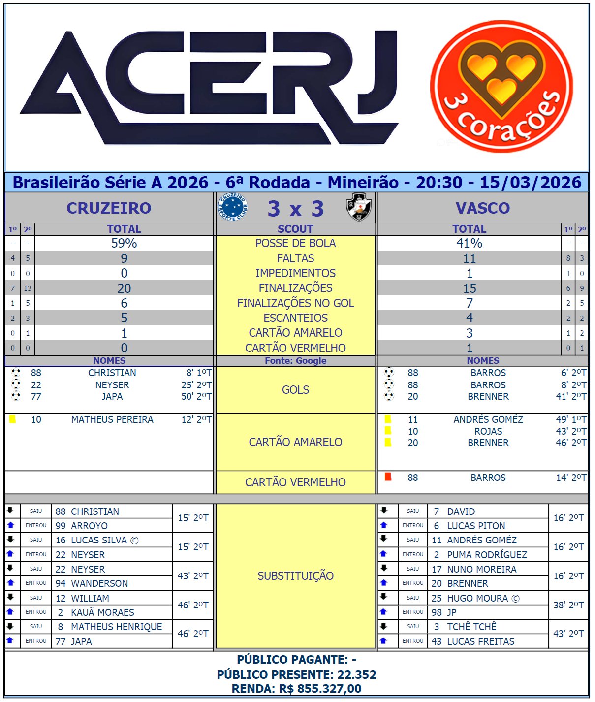 Scout Final de Cruzeiro e Vasco pela 6ª Rodada do Campeonato Brasileiro 2026 no Mineirão (Fonte: Google) #Acerjinforma #brasileirao2026 #CRUxVAS #CruzeiroEC #VascodaGama @Brasileirao @Cruzeiro @VascodaGama