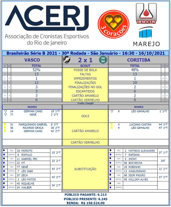 Scout Final de Vasco e Coritiba pela 30ª Rodada do Campeonato Brasileiro da Série B 2021 em São Januário (Fonte: Google) #BrasileiraoSerieB #acerjinforma #VASxCFC #Vasco #Coritiba @BrasileiraoB @VascodaGama @Coritiba