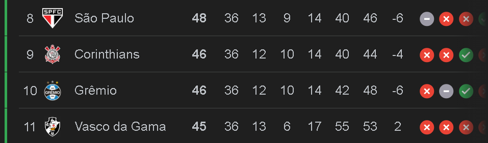 Se vencer as próximas duas rodadas, o Vasco pode garantir uma vaga no G8 do Campeonato Brasileiro, mas com isso depende de tropeços de São Paulo, Corinthians e Grêmio. Por ter 13 vitórias, um fator que é ao seu favor, e um bom saldo de gols, isso pode facilitar.