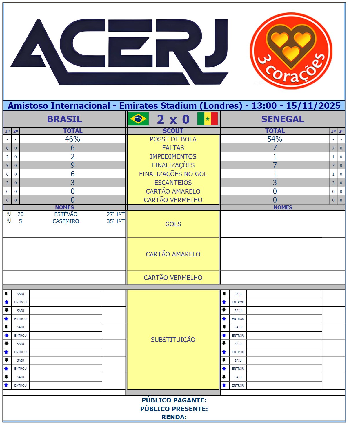 Scout do 1º Tempo de Brasil e Senegal em jogo amistoso de preparação para a Copa do Mundo de 2026 no Emirates Stadium em Londres