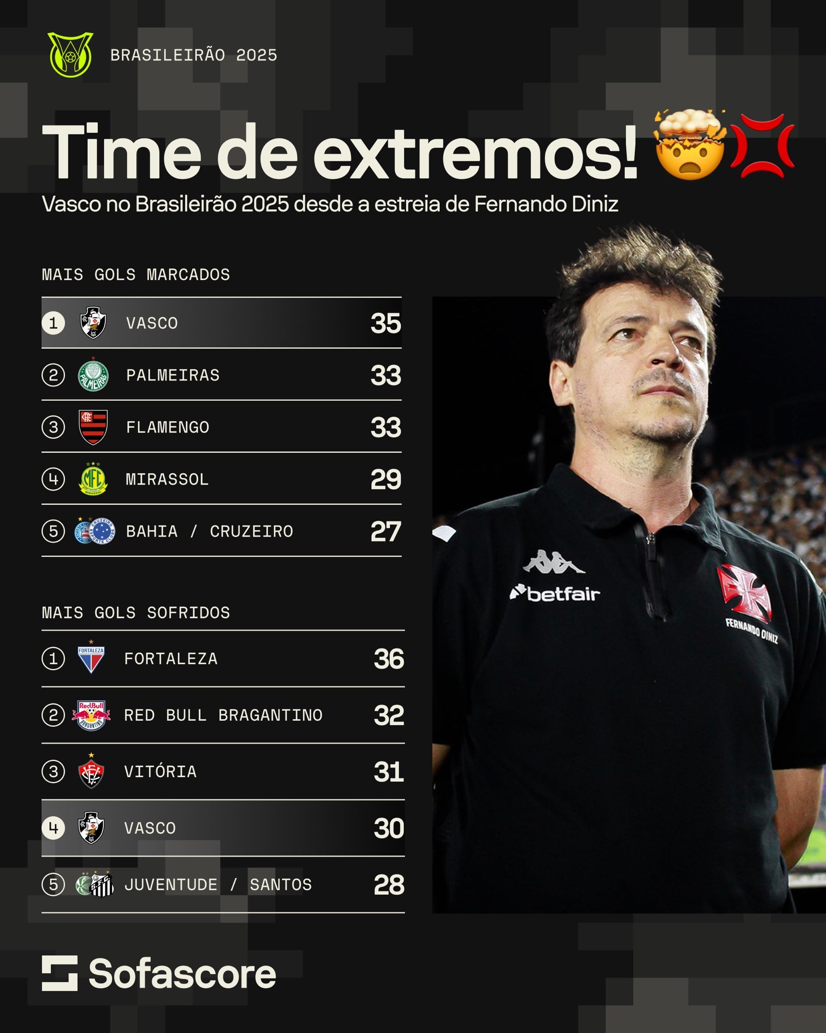 O Vasco é o time com mais gols marcados desde a estreia de Fernando Diniz! Por outro lado, também é o 4º time que mais sofreu gols no período. 🤯🤯