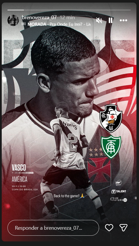 O lateral-direito Breno Vereza está relacionado pro jogo desta quarta-feira, às 15h, contra o América-MG, pela Copa do Brasil Sub-20. O jogador se recuperava de um estiramento na coxa direita. Reforço importante para o time, que perdeu o jogo de ida por 2 a 0.