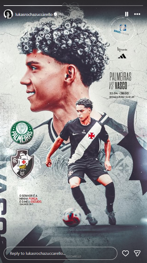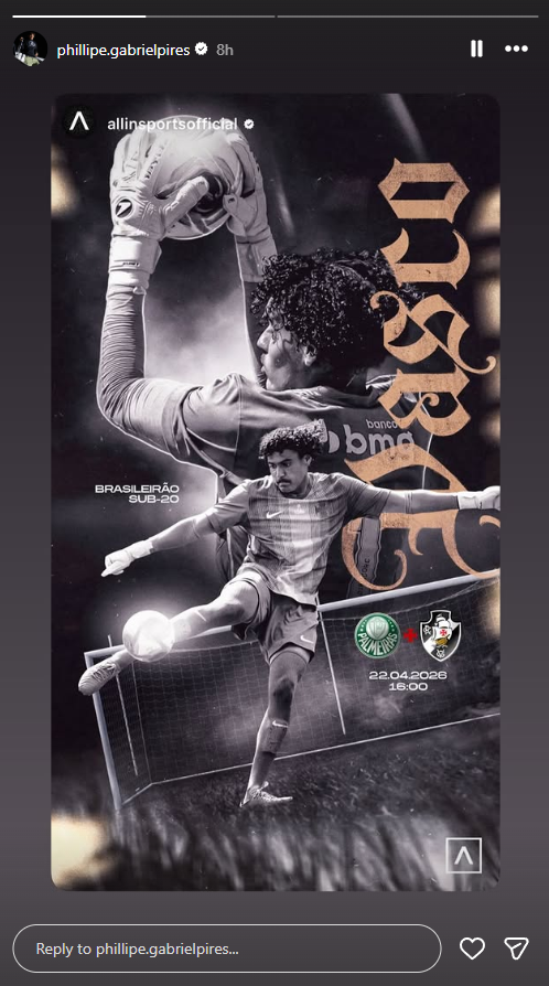 Jogadores do Sub-20 do Vasco publicam imagens destacando o duelo contra o Palmeiras, nesta quarta (22), pelo Brasileiro da modalidade. O jogo acontecerá na Arena Barueri, às 16h00.