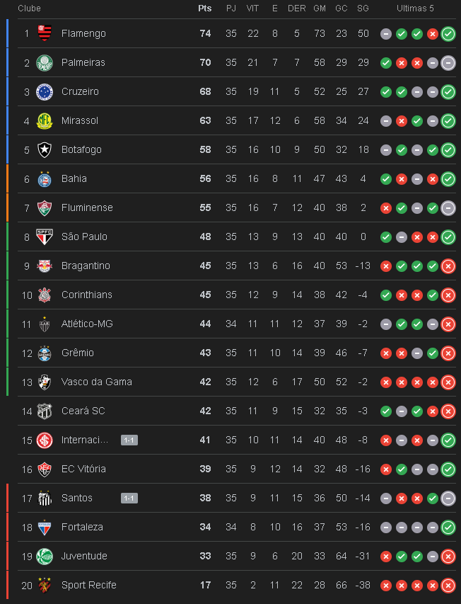 O Santos, que chegou aos 38 pontos na 17ª colocação, enfrenta o Sport, na Vila Belmiro, na próxima rodada.