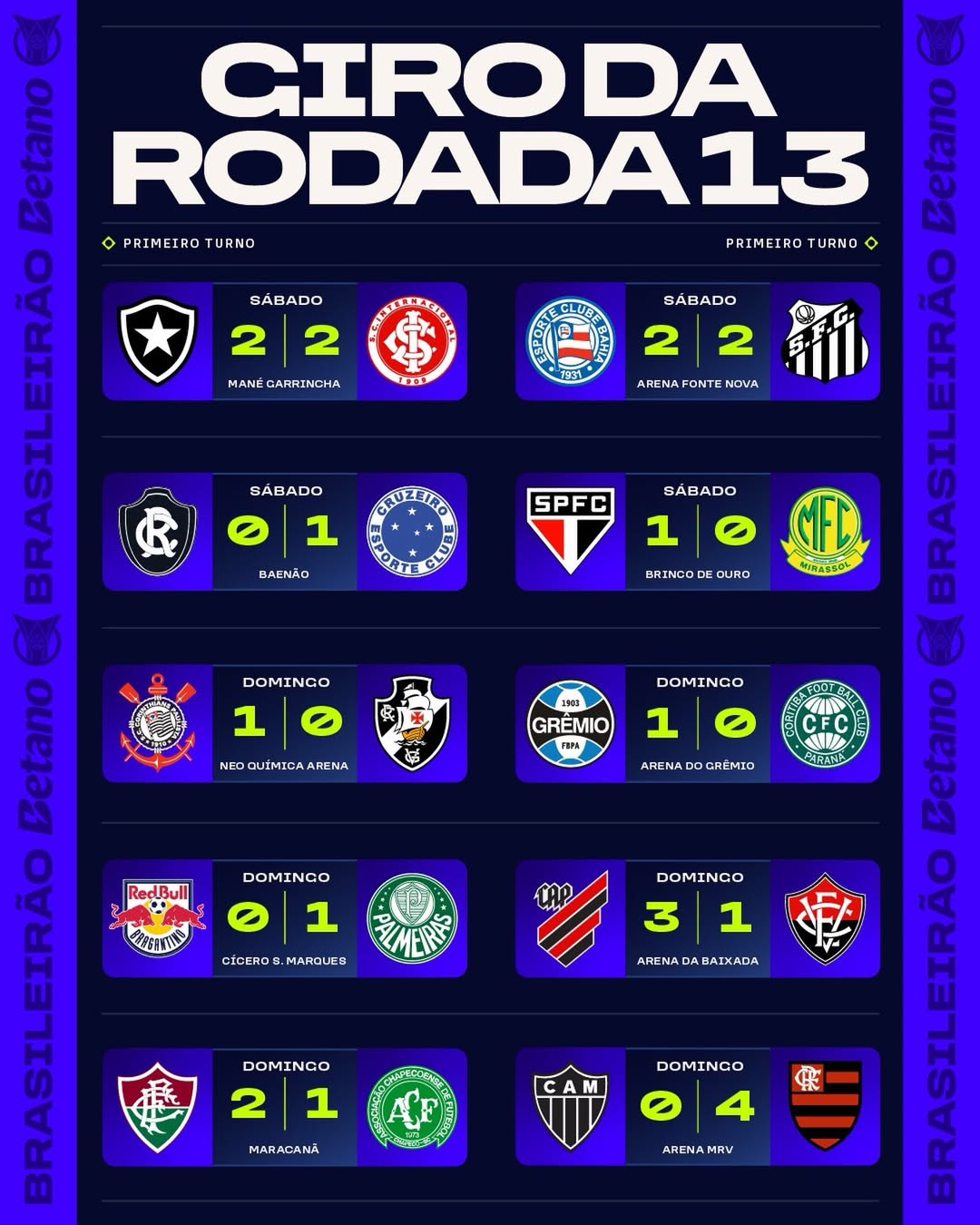 Confira todos os placares da 13ª rodada do Brasileirão Betano! 🔥