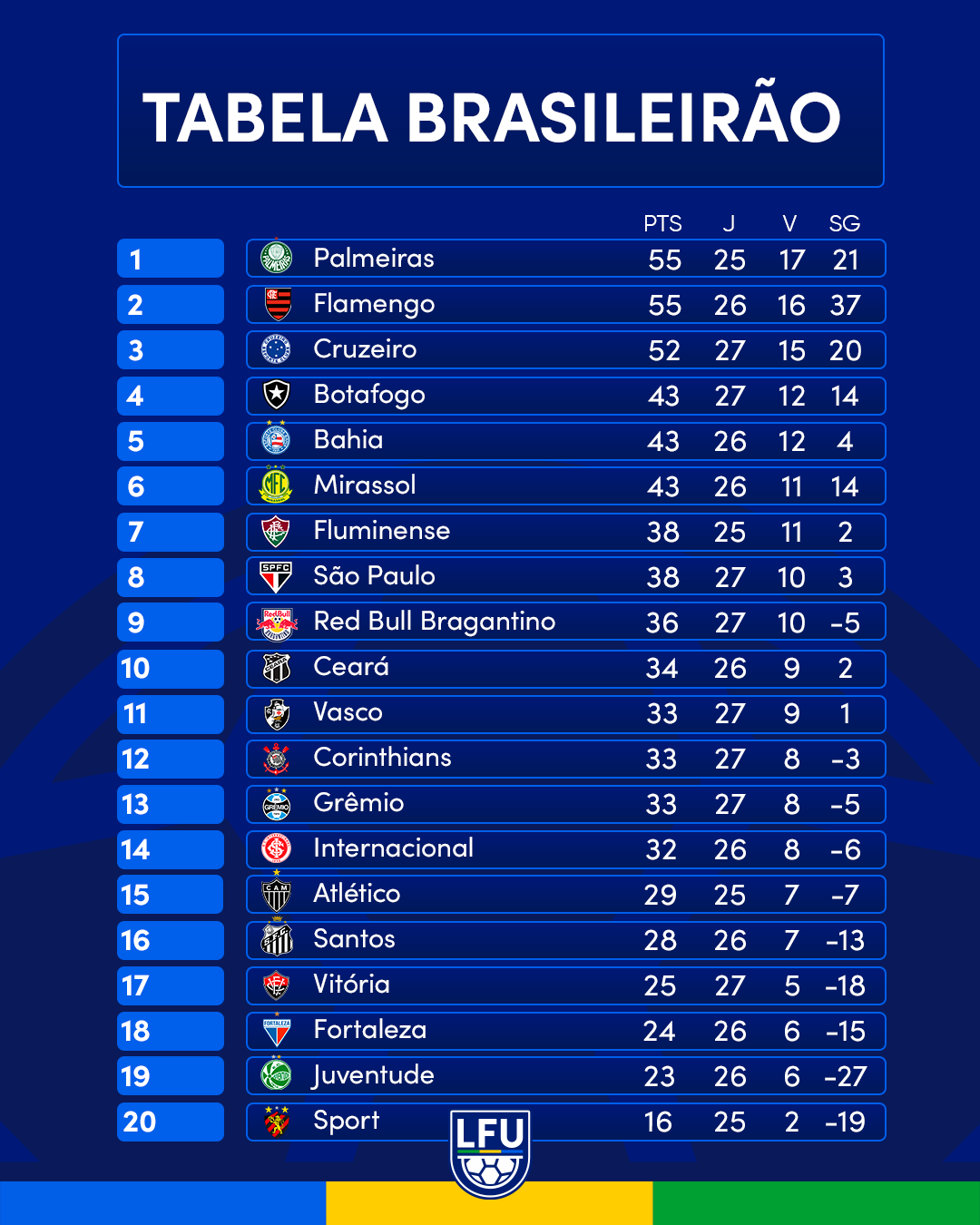 NOVO LÍDER! O Palmeiras assumiu a primeira colocação do Brasileirão, e a briga pelo Z4 segue quente. #Brasileirão