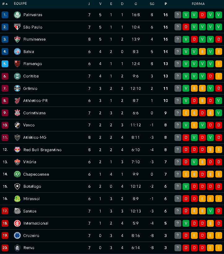 Tabela atualizada da Série A após os jogos deste sábado (21) da 8ª rodada