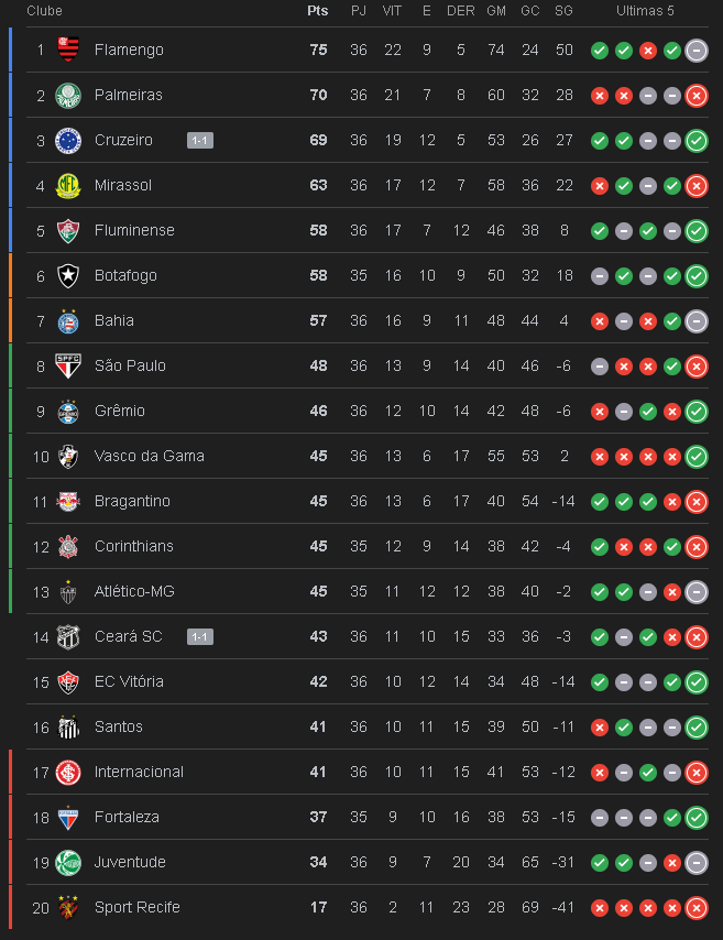 Tabela atualizada da Série A após os jogos deste sábado (29) da 36ª rodada