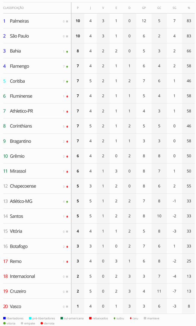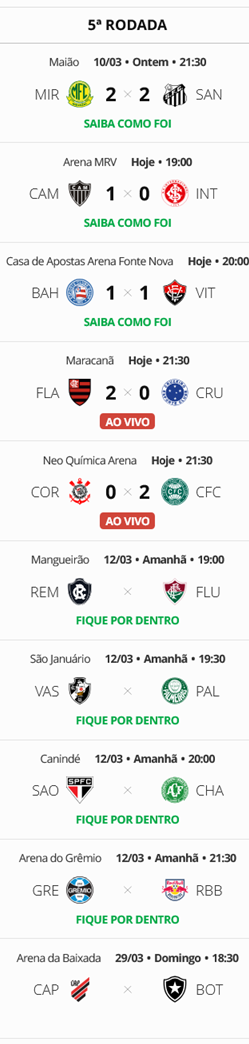 Quatro jogos movimentaram, nesta 4ª-feira, a 5ª rodada do Campeonato Brasileiro. O Vasco, que está na última colocação, enfrenta o Palmeiras nesta 5ª-feira, às 19h30, em São Januário.