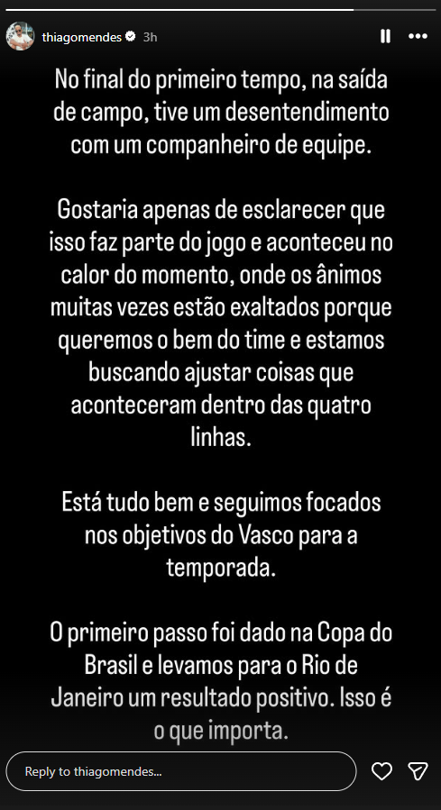Gostaria apenas de esclarecer que isso faz parte do jogo e aconteceu no calor do momento, onde os ânimos muitas vezes estão exaltados porque queremos o bem do time e estamos buscando ajustar coisas que aconteceram dentro das quatro linhas.