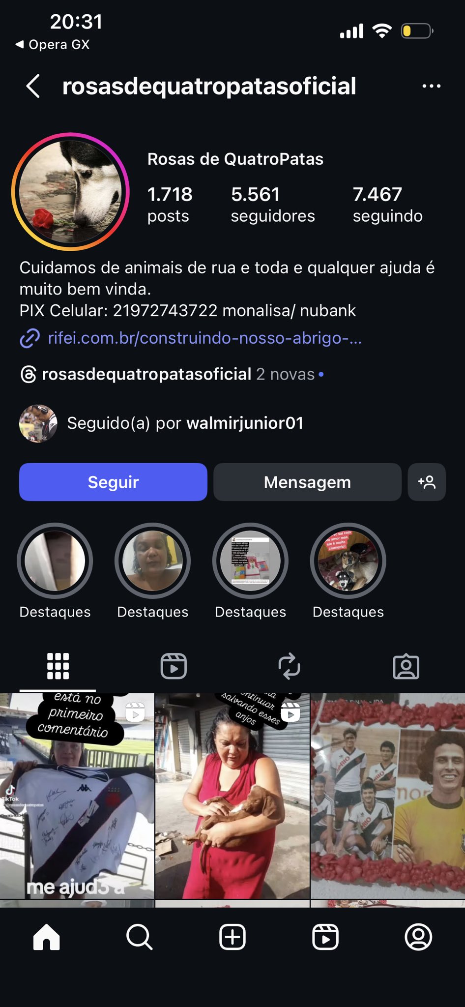 Perfil do Instagram dela onde contém todas as informações de pix e uma rifa que ela está fazendo.